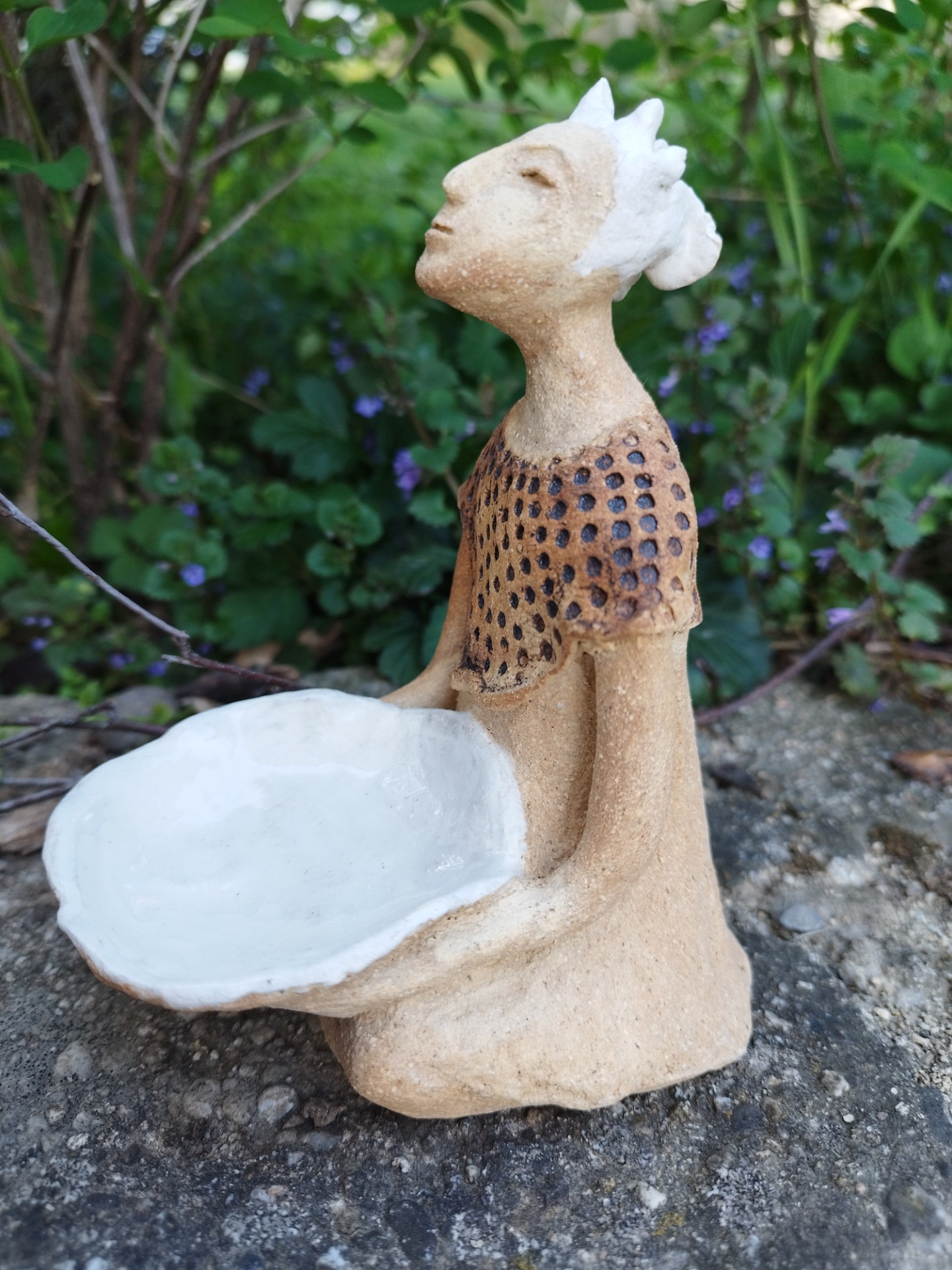 Sedící Bílá je keramická soška vhodná do interiéru i venkovního prostředí. Má 15 cm na výšku, v rukou drží nízkou mísu, která může být svícnem, malým pítkem pro hmyz, místem pro sušené květiny, plody a podobně.