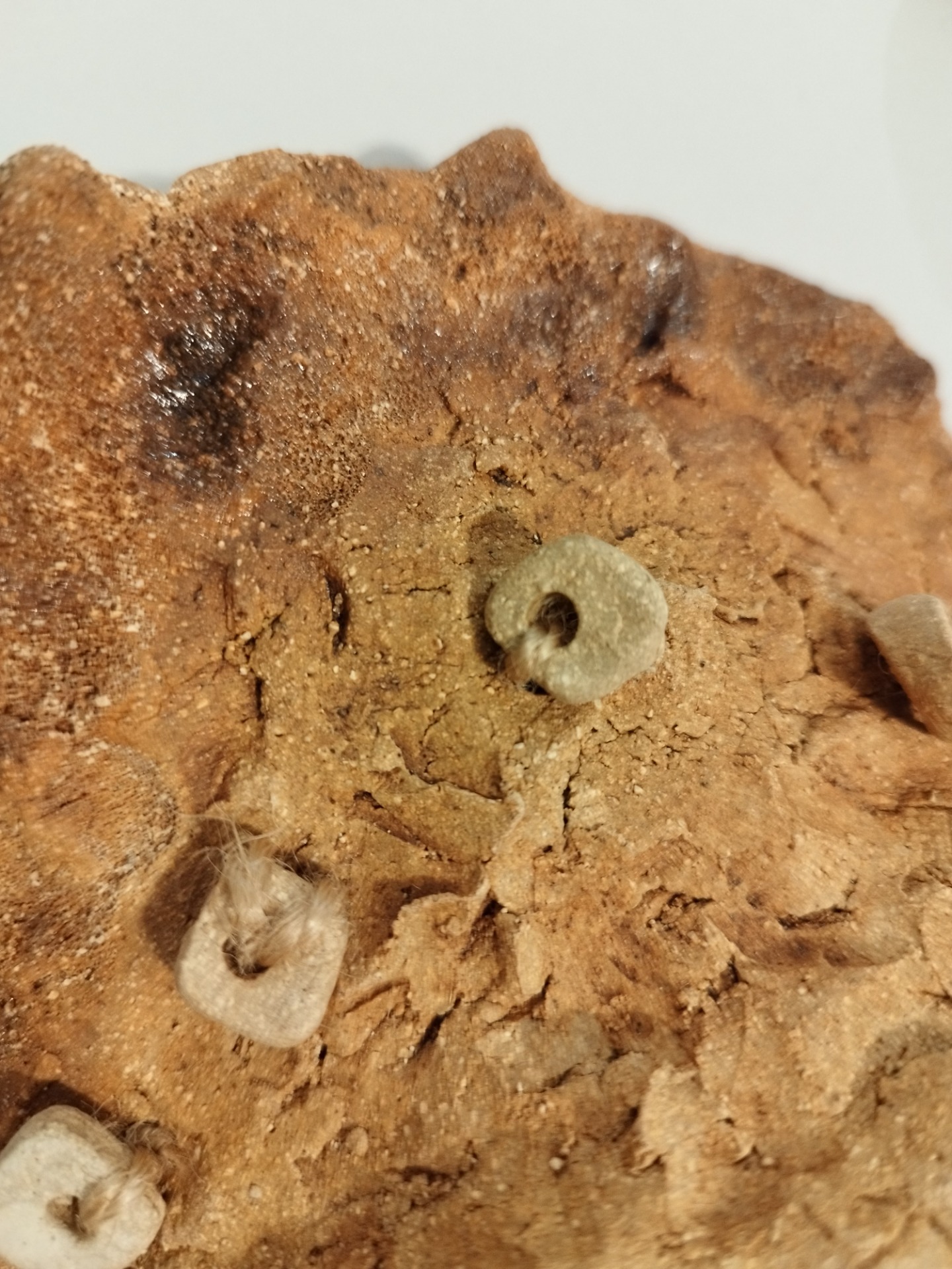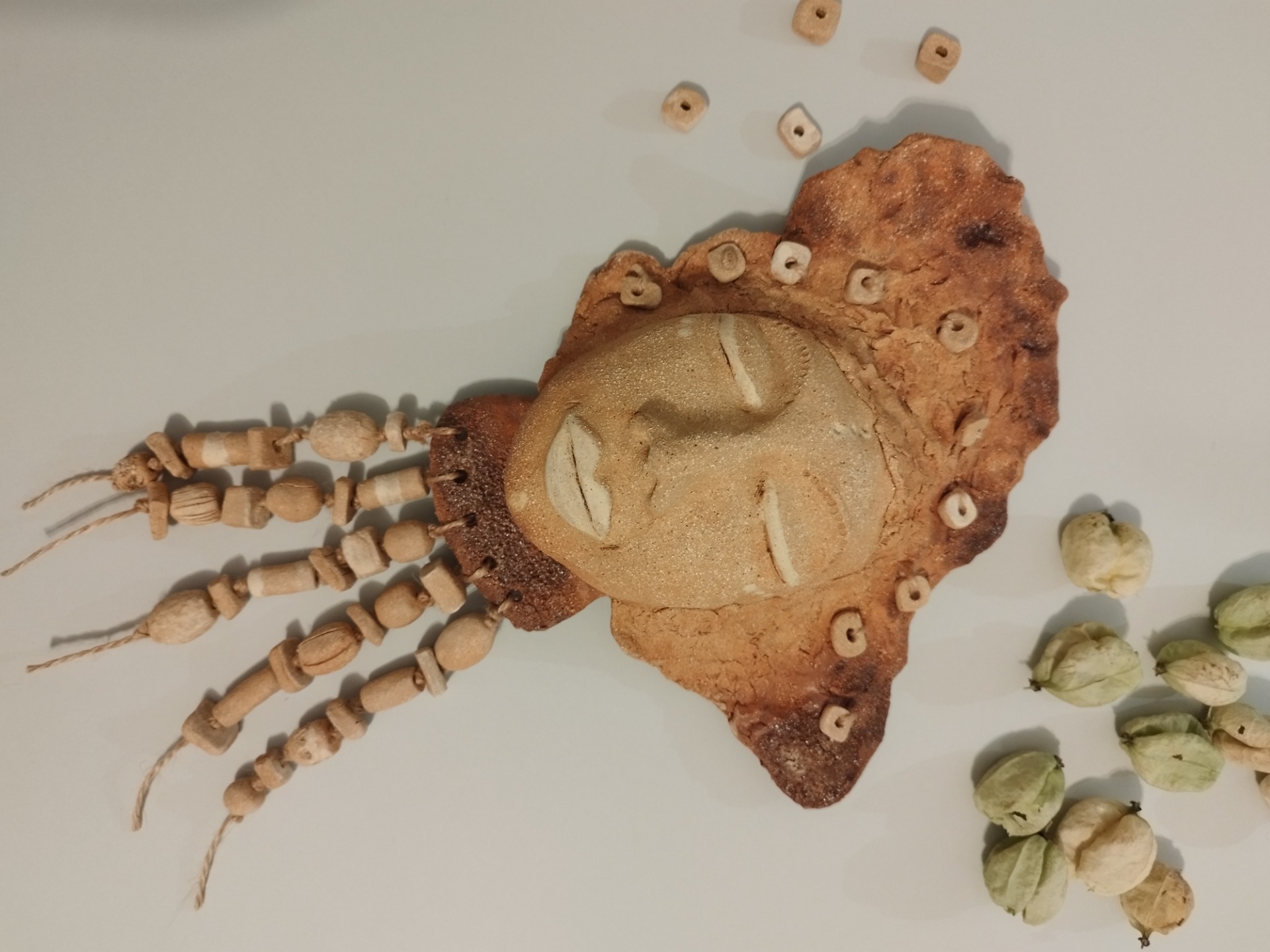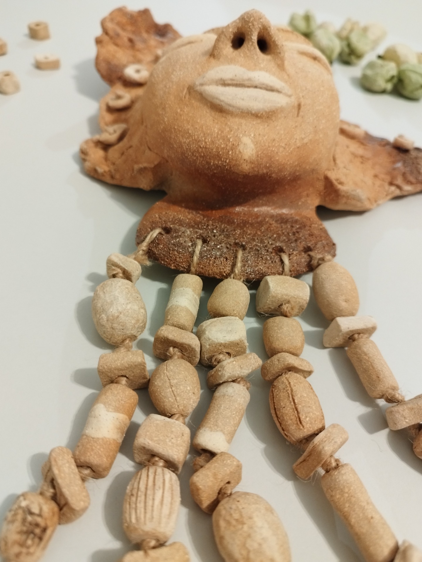 Keramická plastika na zavěšení, vhodná do interiéru i venkovního prostředí. Vyrobena je ze šamotové hlíny, zdobená ručně modelovanými korálky. Od vršku hlavy po krk má přibližně 22 cm, s korálky cca 35 cm.