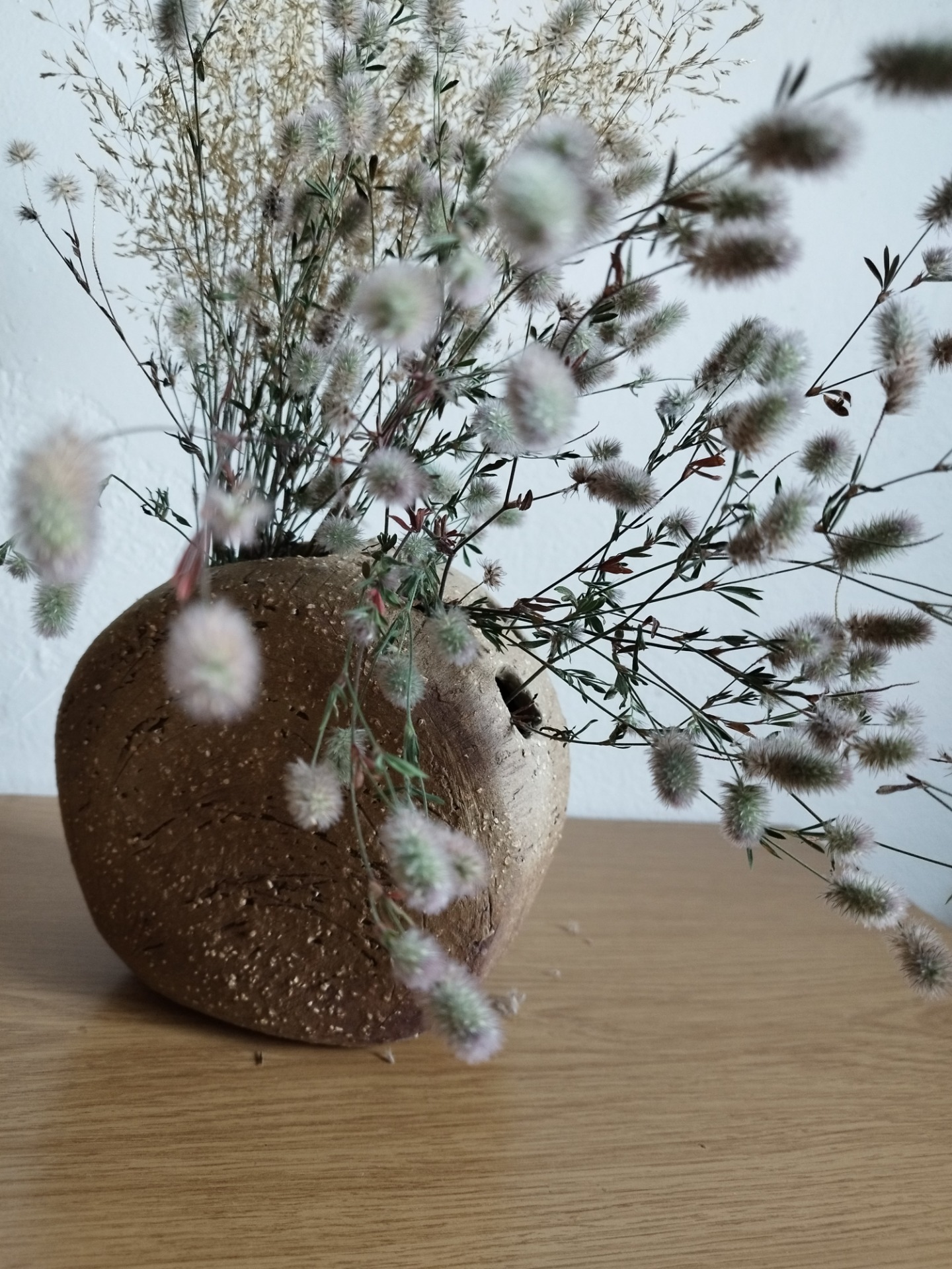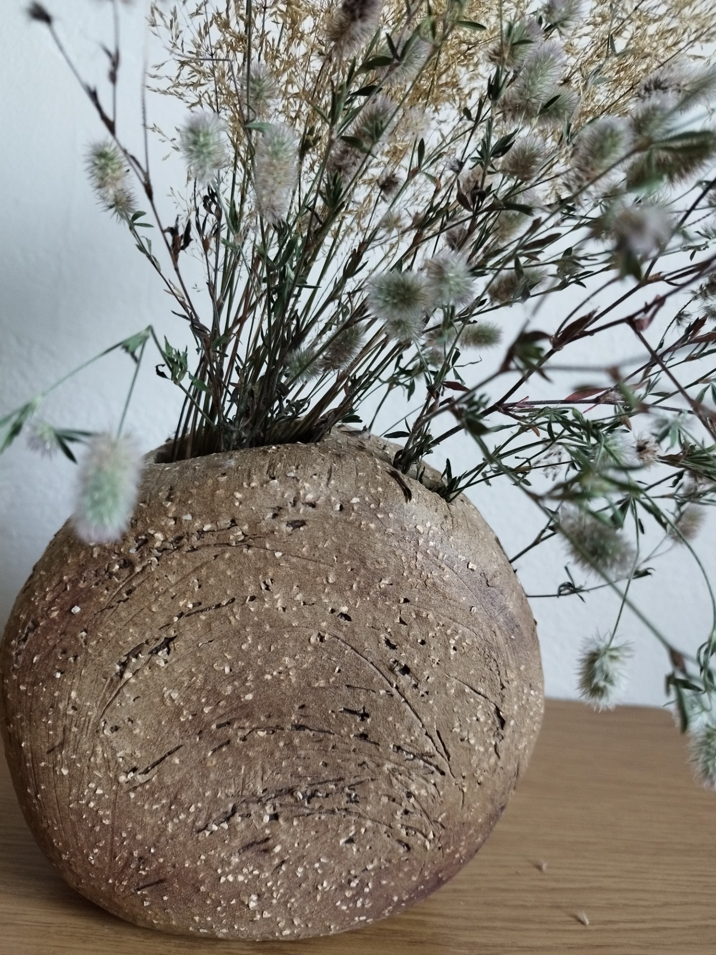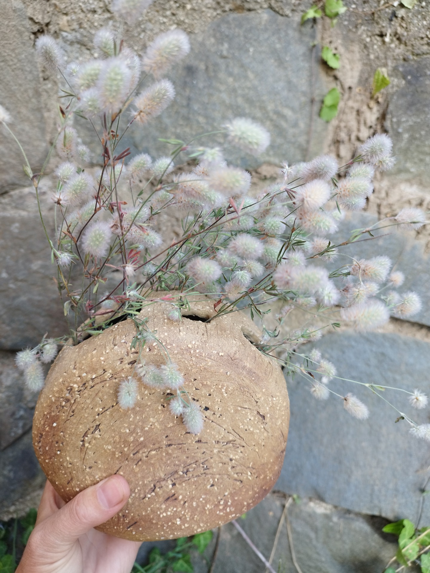 Ručně modelovaná 15 cm vysoká váza je vhodná pro řezané i sušené květiny. Umístěná může být venku i v interiéru. Její přírodní vzhled podtrhují drobné světlé kamínky. Díky pěti nahoře umístěným otvorům je možné květiny snadno esteticky naaranžovat.